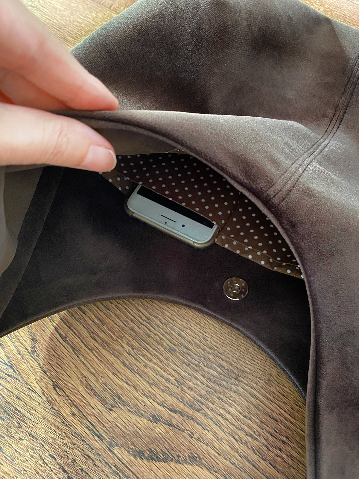 Entièrement doublé, son montage astucieux ne laisse aucune couture apparente. Il offre deux petits compartiments à l’intérieur pour le téléphone et autres accessoires.
