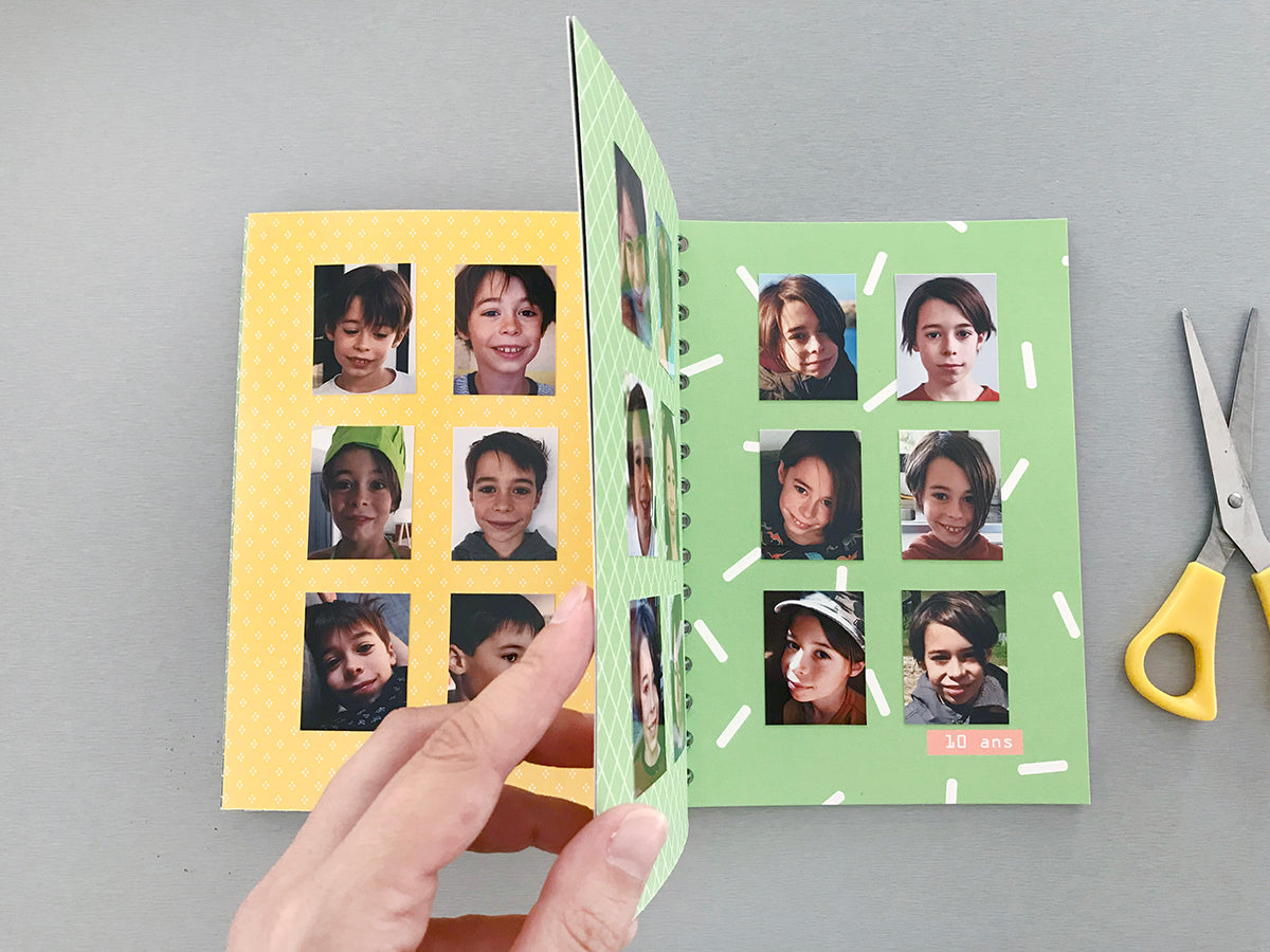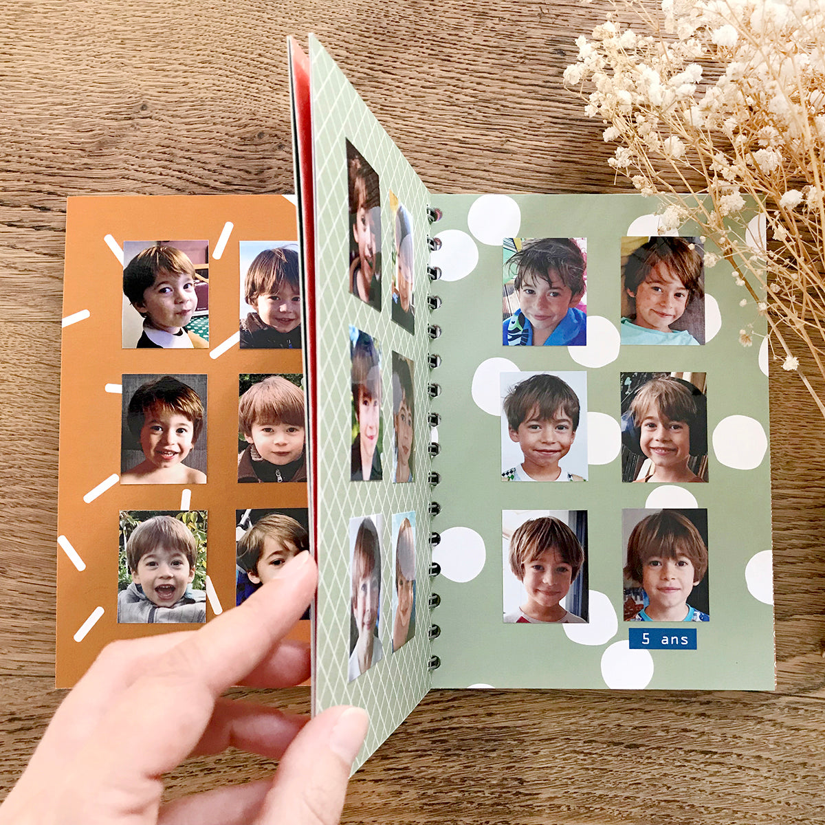 Pour chaque année, une double-page est consacrée aux 12 portraits de l’enfant (format photo d’identité 35x45mm) et une autre double-page est un quartier libre pour y coller des photos plus grandes, les préférées ou celles des événements marquants : les 1ers pas, l'anniversaire, la rentrée à l'école, les vacances à la mer, une photo de famille, ...